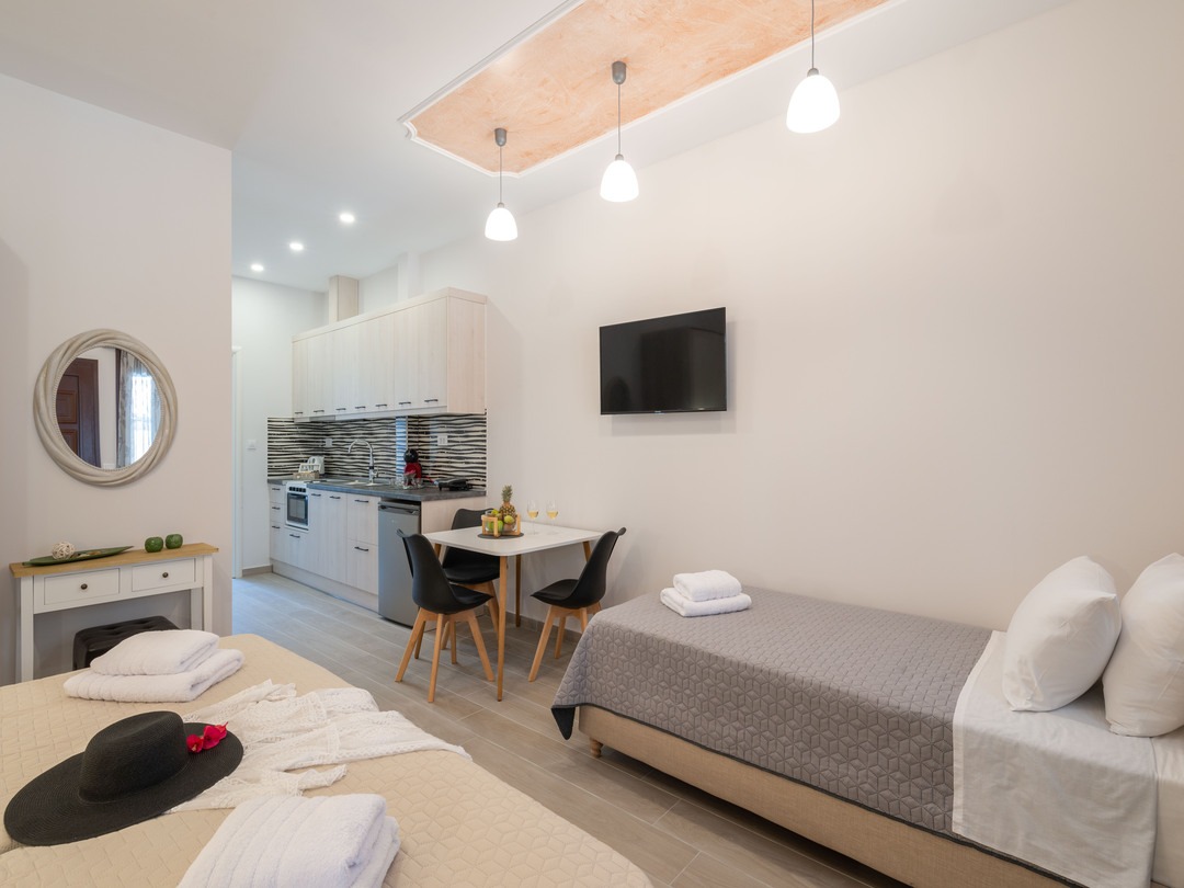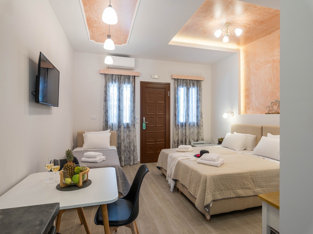 To στούντιο 2 MELTEMI , είναι κατάλληλο για οικογένεια με έως 1 παιδί ή για 3 ενήλικες. Προσφέρει για εσάς όλες τις απαραίτητες παροχές και διευκολύνσεις για ονειρικές διακοπές, όπως είναι ο κλιματισμός, δωρεάν Wi Fi με πολύ υψηλές ταχύτητες, επίπεδη τηλεόραση, κεραμικές εστίες, φούρνο, ψυγείο με κατάψυξη, κλπ. Από την πόρτα του στούντιο δίνεται πρόσβαση στη μεγάλη βεράντα του με θέα προς τα γραφικά δρομάκια των Συβότων αλλά και προς τη θάλασσα και το λιμανάκι που βρίσκεται λίγα μόλις μέτρα πιο μακριά. Απολαύστε το πρωινό σας ή το δείπνο με ένα κρασί ή ένα δροσιστικό ποτό στον όμορφο χώρο που έχουμε επιμεληθεί για εσάς. Εκτός από τη διαμονή, σίγουρα θα απολαύσετε και το μπάνιο σας σε μία από τις τροπικές παραλίες των Συβότων. Τα Virvilis Apartments βρίσκονται σε απόσταση, 200 μέτρων δηλ., λίγων μόλις λεπτών με τα πόδια, από την παραλία «Γαλλικός» που είναι και η κοντινότερη, όπως επίσης και σε πολλές από τις πανέμορφες εξωτικές παραλίες των Συβότων. Αργά το απόγευμα μπορείτε να κάνετε τη βόλτα σας και να απολαύσετε καφέ και φαγητό ή ποτό στα δεκάδες καταστήματα που βρίσκονται γύρω από τα τα Virvilis Apartments
