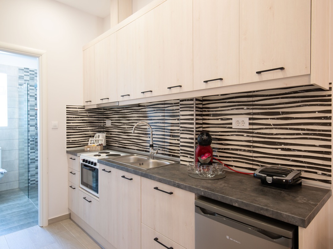 Ένα υπνοδωμάτιο που είναι συνδεόμενο με την πλήρως εξοπλισμένη κουζίνα